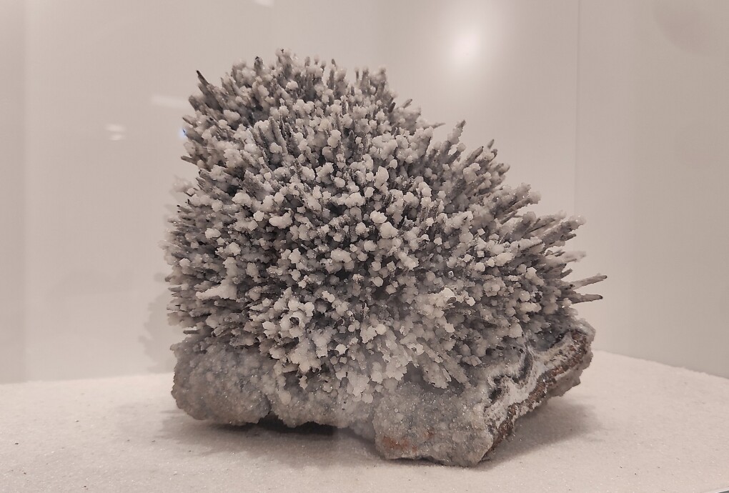 Fast wie im Winterkleid steht die Antimonitstufe in einer Vitrine im Atrium des TurmQuartiers,