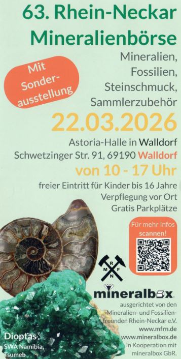 ![]() | Kurz bevor die eigene Mineralienbörse in Remchingen stattfindet, gibt es die Gelegenheit in Walldorf Sammlerkolleginnen und Kollegen zu treffen. Traditionsgemäß findet man auf dieser Börse auch ein reichhaltiges Angebot an Mineralien und Fossilien, neben eher weniger Schmuck.